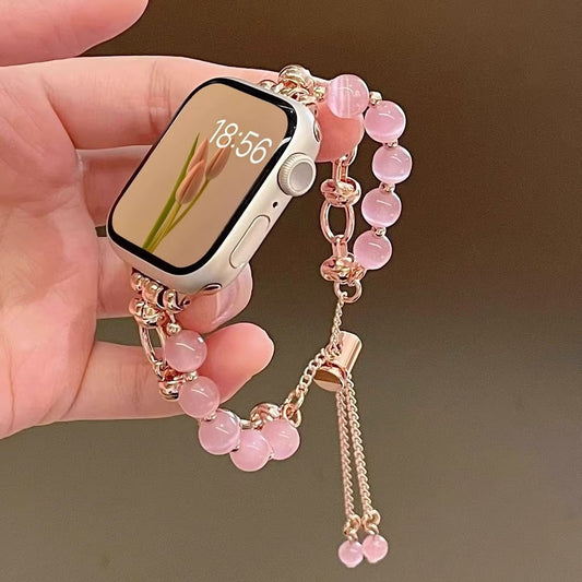 2-pcs Pink Elegant Cat's Eye Beaded Bracelet Band for Apple Watch - Women's Luxury Strap (Compatible Size :42/44/45MM )