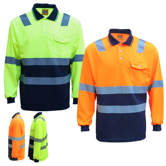 HI VIS Long Sleeve Workwear Shirt w Reflective Tape Cool Dry Safety Polo 2 Tone, Fluoro Yellow /Navy, L