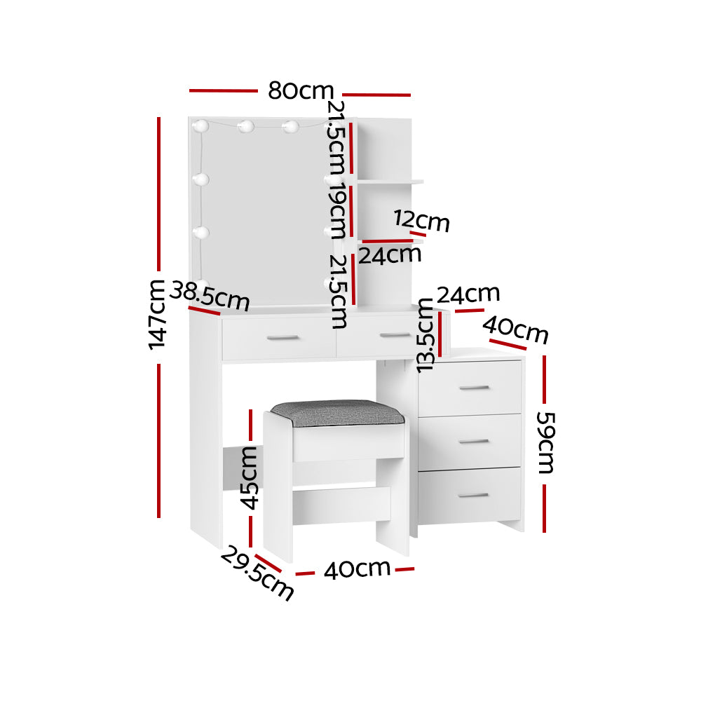 Feel like a star straight out of Hollywood with the Artiss Dale Dressing Table. Packed with generous storage and other convenient features, your new beauty routine will be a breeze. Made from quality particleboard with a white melamine finish, the table is built to last. The Hollywood-style makeup mirror is surrounded by bright LEDs for the perfect illumination. Choose from warm, neutral and daylight white light so you can always look stage-ready. The adjustable side chest features open shelves that you can use to display trinkets or beauty products. Five generous storage drawers give you instant access to your beauty essentials. A foam-padded PU leather stool allows you to sit in comfort while applying make-up or skincare and can be neatly tucked away when not in use. Easy to install and even easier to maintain, you'll love getting ready for the day in front of your new Artiss Dale Dressing Table.