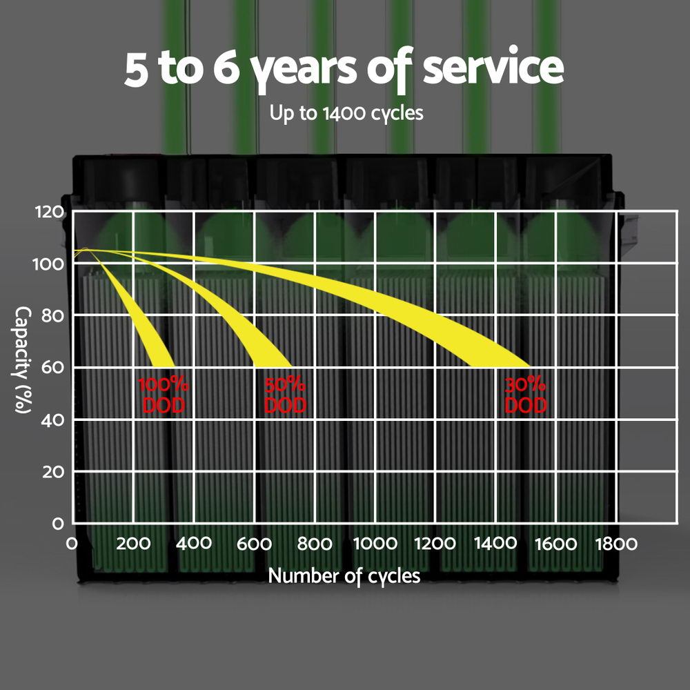 Need portable power? Our Giantz Deep Cycle Battery provides off-the-grid power supply for 4WD vehicles, caravans, campers, trailers, motorhomes, saltwater/marine applications, and all 12V appliances including portable fridges and washers. With better low-temperature performance, the battery will perform perfectly in various environments. The battery features an industry-leading build life of up to 1400 cycles, making it one of the most enduring in its class. What you get is a longer, consistent and more drawn-out charge all the time. With its advanced AGM technology, the battery enables better electrolyte absorption, cyclic stability and frequent charging without affecting performance. The bolt-down terminals also allow for a more reliable experience, and the high oxygen-recombination efficiency results in superior deep discharge recovery. The maintenance-free deep cycle battery is completely sealed, spill-proof and does not leak gas for added safety and durable use. With a convenient carry handle, portability is ensured. When you need power on the road, you need a Giantz Deep Cycle Battery.