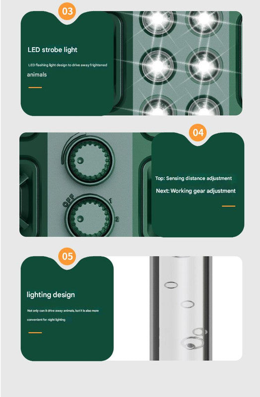 - Powerful Multi-Deterrent System: Utilizes a combination of adjustable ultrasonic frequencies (13-45KHz), audible high-frequency sounds, and super-bright LED strobe lights to startle and repel animals. The added illumination light can also act as a deterrent and provide convenience at night.