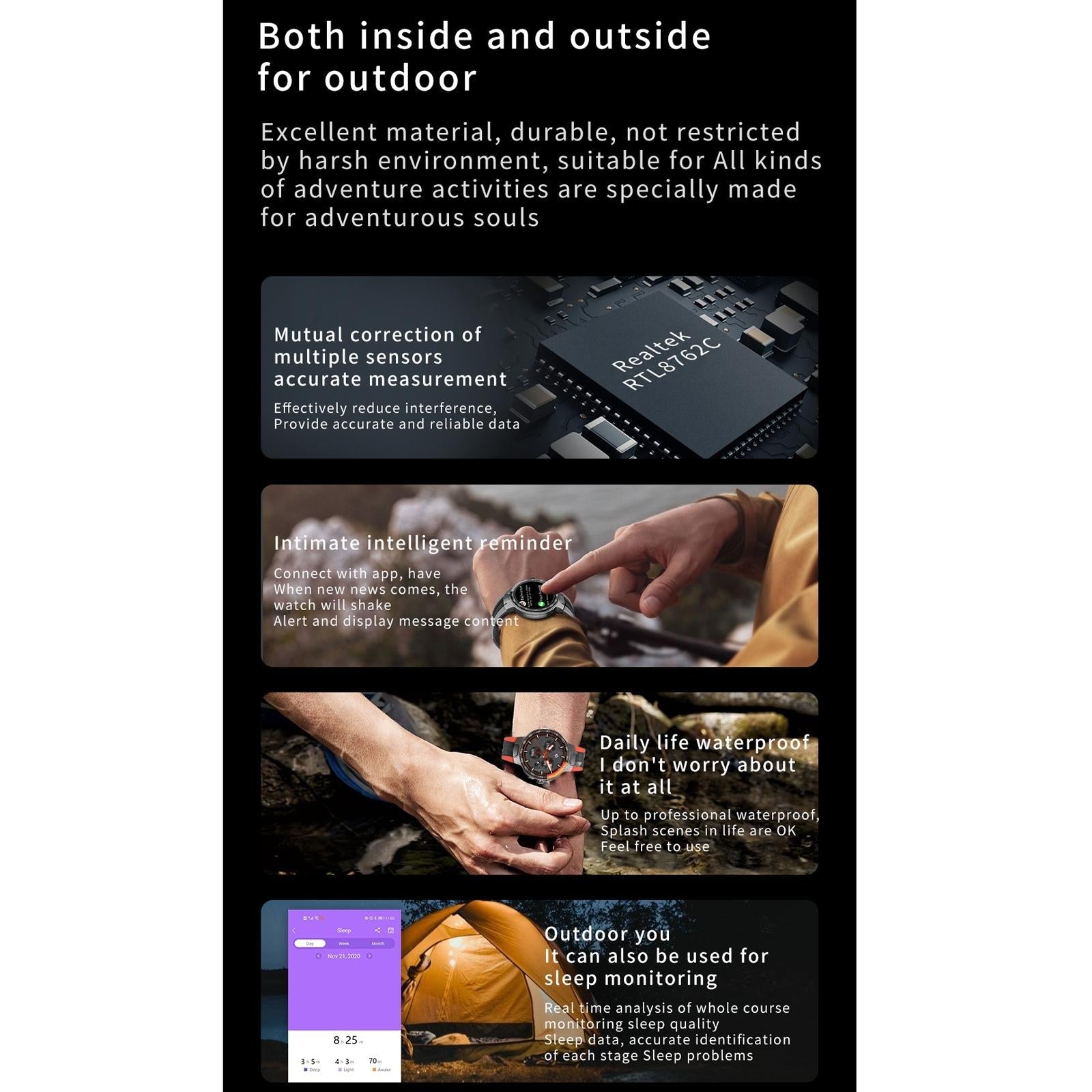 ⢠Sleep monitoring with sleep time and quality analysis